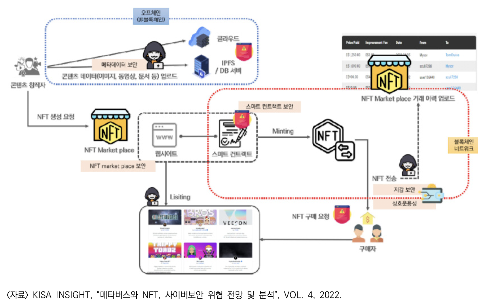 - NFT 보안위협 대응방안: 원본 데이터와 저장소 내의 모든 데이터를 강력함 암호화 기술을 사용하여 보호하고 데이터에 접근하는 사용자 및 시스템을 엄격하게 제어, 인증 강화